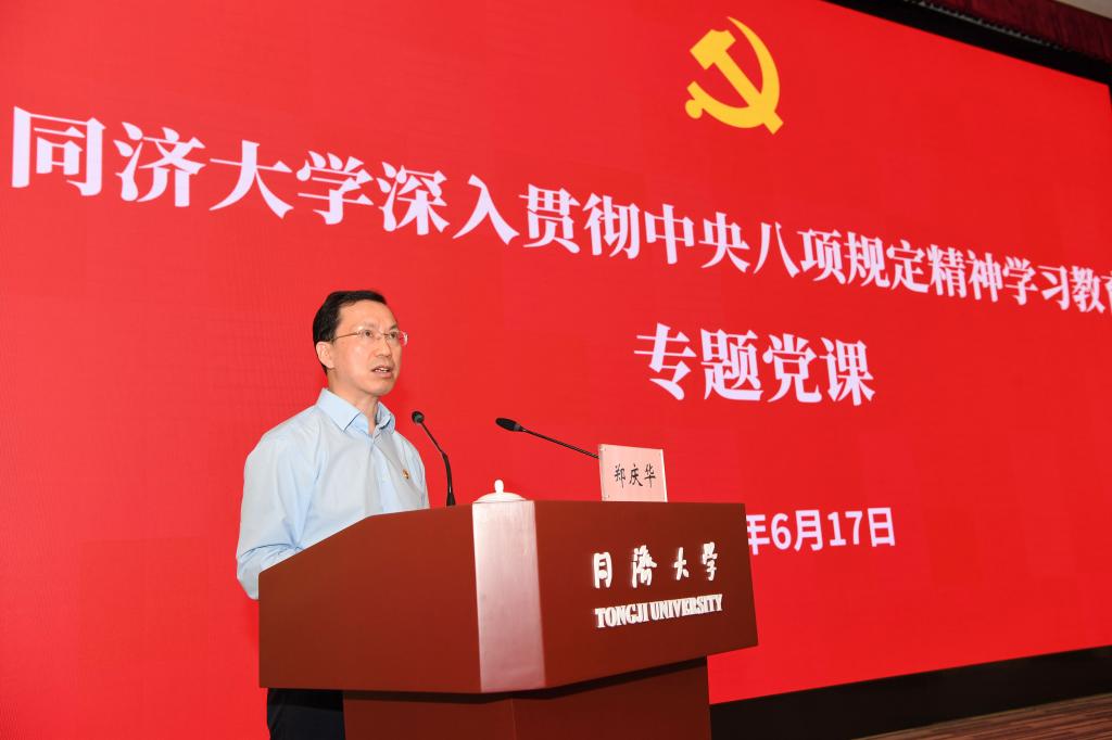 作为同济大学深入贯彻中央八项规定精神学习教育的重要环节,今天(6月17日)下午,同济大学党委书记郑庆华面向校领导班子成员、校党委委员、纪委委员和全体中层干部,讲授深入贯彻中央八项规定精神学习教育专题党课。这也是学校第六期中层干部综合治理能力提升专题研讨班的重要内容。